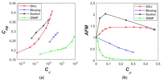 The performance of different AFC methods with respect to momentum coefficient: (a) inviscid flow comparison coefficient; (b) modified normal force coefficient.