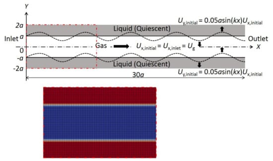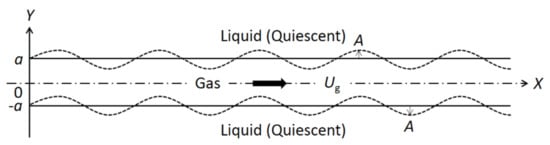 In stability analysis, the base flow is disturbed by small perturbations, whose velocity and pressure are, respectively, and at a time (the subscript is replaced by and to denote the gas and the liquid phase, correspondingly). As shown in Figure 1, the upper and lower disturbed gas–liquid interfaces are represented as and ( is the disturbance amplitude), respectively, where the phase angle difference between two surface waves is 0.