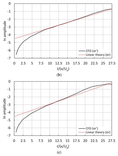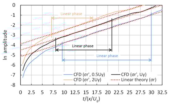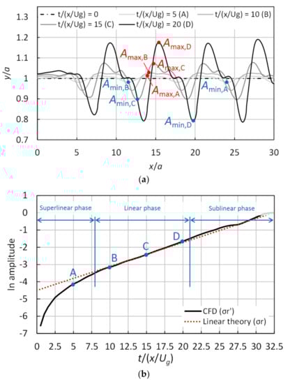 We discussed the results, using as a validation criterion in the present study. The growth rate was compared with the theoretical value of 0.14, obtained by substituting the above values in Equation (9). is a good approximation of the growth rate in this study, focusing on the gradient of the growing amplitude.