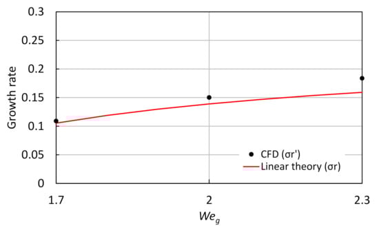 Figure 5 displays the time variation of the disturbance amplitude for different gas Weber numbers ( 1.7, 2, and 2.3) when changing only the surface tension ( 0.59, 0.5, and 0.44, respectively). is a dimensionless value defined as the ratio between surface tension and inertial force; it often controls the instability process, since the capillary forces resulting from the surface tension effect always tend to suppress instability [32]. The line’s gradient of the linear theory increases with . That intercept (at 0.5 and 1.7) was changed to fit the line’s gradient of the linear theory to the CFD result’s curve between −3 and −2. As a result, each intercept was −4.33 at 0.7 and −4.53 at 2.3 (−4.5 at 2). We confirmed a shorter linear phase and an faster transition to the sublinear phase in the case of 2.3 than in the other . The initiation timing of the linear phase is independent of and always constant, while it takes a shorter amount of time to reach the sublinear phase when increases, implying instability enhancement. Namely, the transition to the sublinear phase is sensitive to the Weber number. Figure 6 shows the time-averaged growth rate obtained with , indicating that the disagreement increases along with ; the reason behind this is probably related to the faster transition. The error was about 3.5% for 1.7, about 8% for 2 (used in the present analysis), and about 15.4% for 2.3.