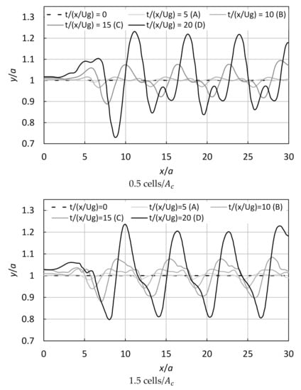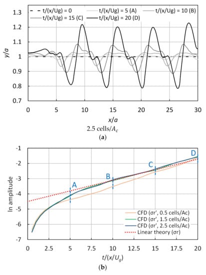 Figure 8 illustrates the time variation of the gas sheet disturbance for 0.5, 1.5, and 2.5 cells/, along with the effect of the interface dispersion at a lower mesh resolution. The amplitude increased after 10 along with the number of cells, and its fluctuation and periodicity changed. Moreover, the boundary condition’s effect in the inlet intensified near 5 to 6 with the decrease in the number of cells at 20. In particular, the negative amplitude troughs did not increase much, except for the first trough near 9 at 0.5 cells/. The results for 1.5 and 2.5 cells/ agreed well with the linear theory, unlike those at 0.5 cells/ before 18. These results imply that amplitude growth cannot be accurately evaluated in a large cell because the influence of numerical diffusion by mesh resolution is too large. At 0.5 cells/, the growing interface was not resolved with the cell as of 5; thus, differences began to appear in the graph’s curve (Figure 8b). This curve of 0.5 cells/ reached the line of the linear theory at 18.
