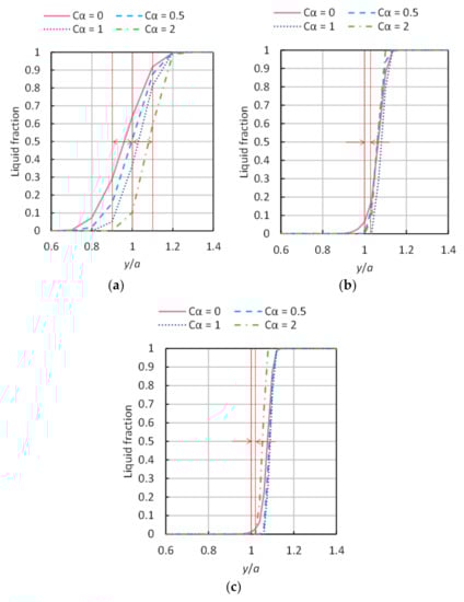 Figure 9 shows the liquid fraction near the interface for different IC coefficients (0, 0.5, 1, and 2) at 0.5, 1.5, and 2.5 cells/ and after 15 for 15. The width marked with arrows in the figure shows the cell spacing. The IC coefficient influenced the gradient of the liquid fraction distribution near the surface, showing increased improvement at 0.5 cells/. However, the effect of the number of cells was larger than that of . Furthermore, the distribution’s gradient did not always change at the same position and changed by only 2 when the IC coefficient was varied at 2.5 cells/; this tendency was also confirmed at 5 cells/, but this result is not reported here. This means that the correlation between IC coefficient and cell size apparently had some effect, and 2 had a different effect from the other IC coefficients under small numerical diffusion by mesh resolution.