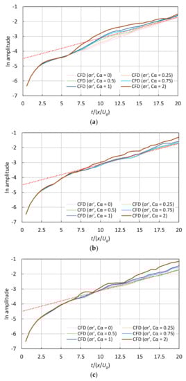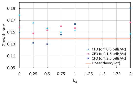Figure 10 displays the plots of the disturbance amplitudes for different numbers of cells (0.5, 1.5, and 2.5 cells/) and , showing the larger effects of the IC method while decreasing the mesh resolution; larger values increased the growth rate quicker, although it then tended to overshoot. The IC method worked effectively for 0.5 and 0.75 at 0.5 cells/. Figure 11 illustrates the growth rate as a function of the IC coefficient for different numbers of cells, revealing two things: (1) affected the growth rate when ranging between 0.25 and 0.5 inclusive at 1.5 cells/ and between 0.25 and 0.75 inclusive at 2.5 cells/; (2) at 0.5 cells/, the growth rate approached that of the linear theory with increasing . For (1), 0 0.75 was reasonable at 1 cell/ from conservative judgment, and the growth rate closest to the linear theory was at 0.25 for both mesh cases (1.5 and 2.5 cells/). Kawasaki et al. [19] have reported that 0 0.5 leads to suitable numerical results for the simulation of collisions between the bore and a structure; their results are similar to the present result, which indicates that 0 0.75 is an appropriate range to resolve their problems regarding the intensity of the IC coefficient. However, 2, at 1.5 and 2.5 cells/ seemed an inappropriate value because the differences between the CFD and the linear theory were wider. This large difference can be confirmed not only in Figure 11 but also in the gradients of the curves at 2 in Figure 10. As for (2), it means that the IC method worked well, especially on the dispersion interface. 2 at 0.5 cells/ (indicating the growth rate closest to the linear theory) reduced the error from 29% (without the IC method) to 6%, as shown in Figure 11. The curve’s gradient for 2 at 0.5 cells/ did not agree with the line of the linear theory in Figure 10 due to the calculation accuracy problem caused by the mesh resolution. Nevertheless, that curve’s gradient fit the line’s gradient of the linear theory, and the negative diffusion worked well.