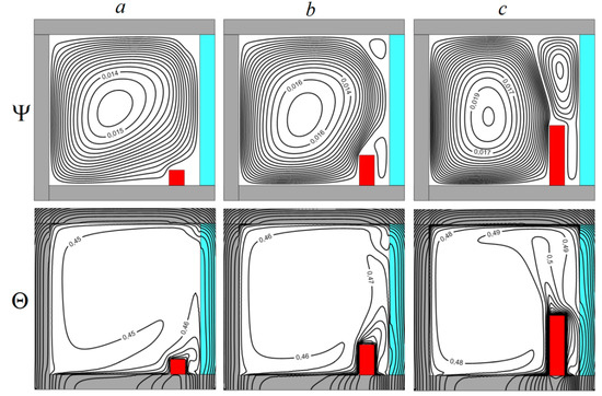 Streamlines Ψ and isotherms Θ for various values of heater height l at : l/L = 0.1—(a), l/L = 0.2—(b), l/L = 0.1—(c).