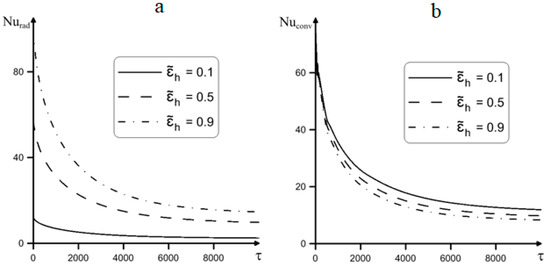 In Figure 7, variations of Nu at the thermally-generating element surface are shown. This figure illustrates that enhancing the surface emissivity of the heater leads to different effects for the average radiative and convective Nu. It is clearly shown that the energy transfer due to radiation is significantly reduced with a decrease in . At τ = 10,000, Nuconv decreases up to 43% at the changing of the heater surface emissivity from 0.1 to 0.9. It should be noted that the decrease in the values of the dimensionless integral heat transfer coefficient with time is associated with the formulation of initial and boundary conditions.