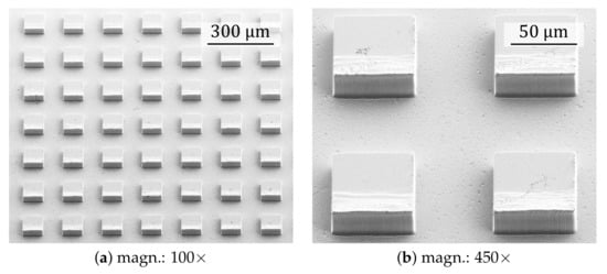 - Foltyn, P.; Guttmann, M.; Schneider, M.; Fest-Santini, S.; Wildenschild, D.; Weigand, B. Fabrication and evaluation methods of micro-structured surfaces for droplet impact experiments. In Droplet Interactions and Spray Processes; Lamanna, G., Tonini, S., Cossali, E., Weigand, B., Eds.; Fluid Mechanics and Its Applications; Springer: Berlin/Heidelberg, Germany, 2020; pp. IX, 294. [Google Scholar]