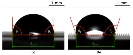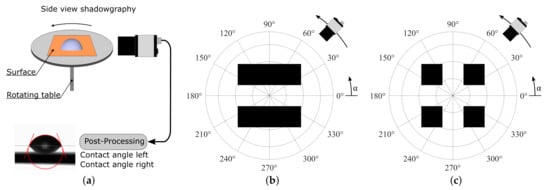 - Foltyn, P.; Restle, F.; Weigand, B. 360∘ Evaluation of Projected Contact Angles of Static Droplets on Structured Surfaces; Droplet Impact Phenomena & Spray Investigations (DIPSI): Bergamo, Italy, 2019; pp. 14–17. [Google Scholar] [CrossRef]