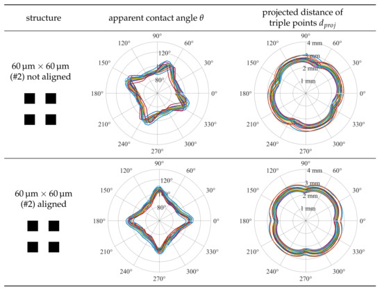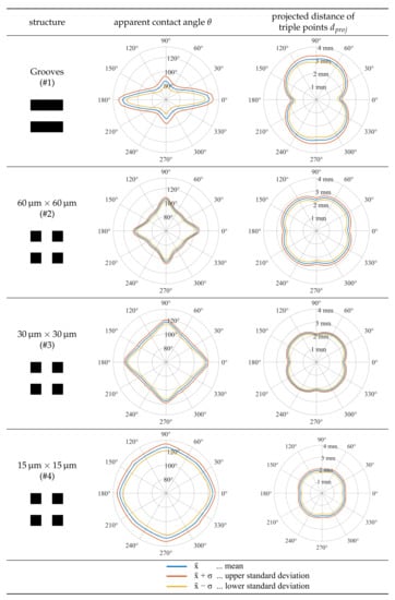4.2. Results of Apparent Contact Angle Measurements on Structured Surfaces
