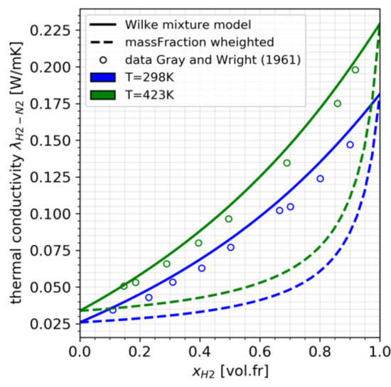 Figure 1 compares exemplarily the thermal conductivity of a H2-N2 mixture, calculated with Wilke’s model and the default mass weighted summation model available in OpenFOAM-6 against experimental data 12]. It is evident that the thermal conductivity is significantly underpredicted if the default model is employed.