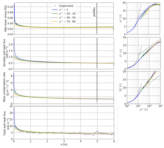 In containmentFOAM, the condensation rate is treated as an additional outgoing flux through the wall face of a cell. Similarly, all transported quantities associated with the condensed mass are removed from the domain directly through the advection term. For further details on the model, its implementation and validation against the SETCOM (Separate Effect Tests for Condensation Modeling) forced convection database are summarized in [16]. SETCOM is a flow channel with square cross-section (edge length of 0.45 m). One side of the 6 m long channel consists of a cooled wall, while the other walls are adiabatic. Figure 2 exemplarily summarizes the wall fluxes and boundary layer profiles obtained by the implemented wall treatment for four different meshes with a boundary layer resolution of y+ ~ 1(resolved) to y+ ~ 80 (modeled) for the SETCOM test C_(Uin ~ 3 m/s, Tin ~ 70 °C, XH2O,in ~ 30 vol.%, Twall ~ 10 °C). As expected, the implemented wall functions provide a grid-independent solution of the wall shear stress, the sensible wall heat flux and the condensation rate once the boundary layers are developed (~1 m downstream the inlet). Comparing the dimensionless boundary layer profiles extracted at channel length of x = 5 m, a consistent representation can be determined for the different boundary layer resolutions. Compared to the measured total (i.e., sensible and latent) wall heat fluxes, again a reasonable and mesh insensitive representation by the model can be concluded for forced convection heat and mass transfer.