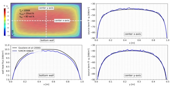 Validation of the Monte Carlo RTE Solver against the Goutiere test case 3 [26]—computed wall heat flux and source terms due to gas radiation.