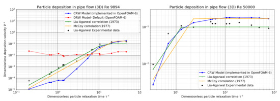 A first distinct validation of the CRW implementation is conducted against experimental data of particle deposition in turbulent pipe flow by Liu and Agrawal [33]. All particles touching the wall are considered as deposited in this simulation. As shown in Figure 4, the dimensionless particle deposition velocity is predicted with reasonable accuracy in forced convection flows. For the particles in the diffusion-impaction regime, the model slightly under-predicted the deposition, which is currently under investigation.