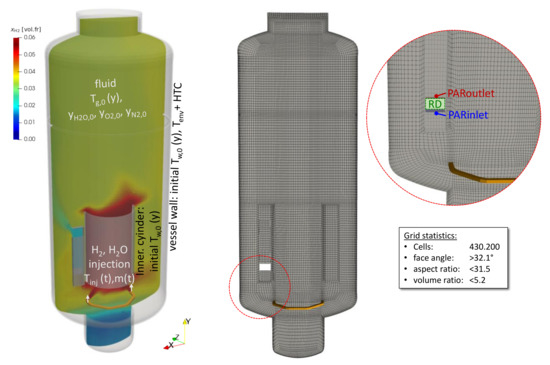 A comprehensive test series on the performance of passive auto-catalytic recombiners (PAR) has been performed within the OECD/NEA THAI projects for different PAR types. For this validation run, the test THAI HR12, conducted in the frame of the OECD/NEA THAI-1 project [50] is considered. Its test configuration is illustrated in Figure 5 (left). A Framatome PAR FR380T is mounted at the outer side of the inner cylinder. The vessel is preconditioned at accident relevant conditions i.e., an initial gas and structure temperature of T0 ~ 150 °C at P0 ~ 3 bar and an initial steam concentration of XH2O,0 ~ 60 vol.%. H2 is injected with a mass flow rate of up to 0.45 g/s via a ring feed line below the PAR in two phases. The modeling challenge of this application-oriented test case is the strong effect of gas radiation heat transfer and wall condensation on the vessel pressure and thus also recombination rate. Besides, there is an initially low oxygen concentration of XO2,0 ~ 8 vol.%. After the first injection phase, the PAR has consumed most of the available oxygen and runs into oxygen starvation at the beginning of the second H2 injection phase, i.e., the conversion rate and efficiency is impaired.
