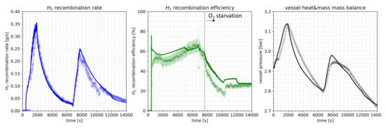On basis of the consistently predicted boundary conditions, the major PAR performance parameter, the H2 recombination rate is evaluated and validated against the measurements. (Figure 7, left). The simulation reveals a well comparable trend, both qualitatively and quantitatively. To highlight the effect of oxygen starvation qualitatively, the recombination efficiency (XH2,out/XH2,in) is compared in Figure 7 (middle). One can observe the drop due to increasing lack of oxygen in the second injection phase, which is predicted consistently with the experimental observation.