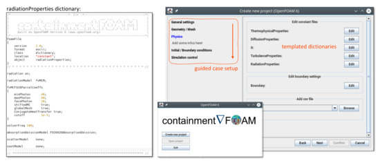 In contrast to commercial multi-purpose CFD packages, containmentFOAM is rather an expert tool that demands a skilled user. Application of CFD to containment flows requires the combination of multiple models to represent the underlying physics and safety systems. The single models are typically developed within individual PhD research projects and comprise of comprehensive expert know-how (e.g., in the definition of numerical parameters or the combination of available sub-models). Their definition is conducted primarily within individual text files, so-called dictionaries (see Figure 8, left), but may also involve links to other dictionaries. It is obvious that there is a certain potential for user dependent errors, resulting from a false or incomplete model definition or inconsistencies among the dictionaries, which must be avoided to ensure trustworthy and reproducible results. Classically, this can be done e.g., by comprehensive documentation (document or Wiki), commented dictionaries, and tutorial cases. Nevertheless, such documentation cannot consider all details and dependencies and is often lagging the code development. For these reasons, the containmentFOAM package relies on a guided case setup process (see Figure 8, right).