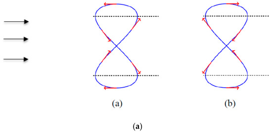For a flow from left to right, the plus (+) sign in Equation (2) corresponds to a motion which is counter-clockwise in the upper x-y plane, and the minus (−) sign to a clockwise motion in the upper x-y plane. It is further noted that the in-line oscillation can be characterized by a phase shift, θ, with respect to the transverse oscillation, i.e., , resulting in different trajectories and direction of the cylinder motion. The figure-eight counter-clockwise and clockwise motion corresponds to values of phase shift θ = 0 and θ = π, respectively. A different physical problem is defined for each of the two motions. Considering, for example, the location with maximum distance from the x-axis, the cylinder is moving against or in the direction of the incoming stream, for counter-clockwise or clockwise motion, respectively (Figure 1a). Other values of θ, than 0 and π considered here, correspond to different orbits, and thus different flow dynamics and associated forces. The present study only considers the cases of the two figure-eight trajectories, which are encountered in VIV, and can be used as reference cases, against which others can be compared.