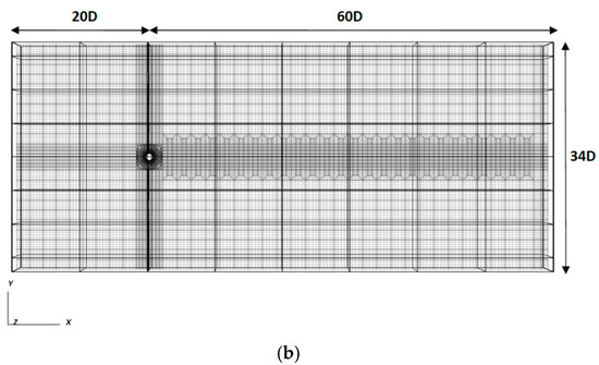 In the x-y plane, 2056 spectral elements are used for domain decomposition. In the z-direction, 10 element layers are used. Thus, 20,560 three-dimensional spectral elements are used in total, and the resolution of each element is 8 × 8 × 8. The spectral element grid is shown in Figure 1b. For time discretization, a third order semi-implicit temporal scheme has been adopted [30]; the time step is Δt = 0.001. The accuracy of the resolution used in present study has been verified by thorough validation and resolution tests, also including comparisons against experiments, as reported in [22].