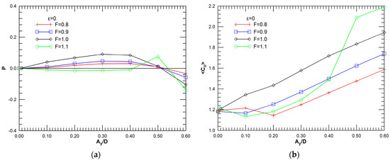 We start by presenting results for the reference problem of transverse-only oscillation (ε = 0). Figure 2a presents the variation of time-average power transfer parameter, P, with oscillation amplitude, for the frequency values of the present study. These results indicate that, for F ≤ 1, P initially increases with Ay/D, reaches a maximum, and decreases for non-dimensional oscillation amplitude higher than about 0.4; negative values of P are obtained for Ay/D values higher than about 0.5, in agreement with the results of Leontini et al. [9] and Peppa et al. [32] for two-dimensional flow at lower Reynolds numbers. For the case of above-resonant forcing (F = 1.1), among the amplitudes considered, a positive value of P is only obtained for Ay/D = 0.5, accompanied by a drastic increase in time-average drag coefficient, <CD> (Figure 2b). The drag coefficient is monotonically increasing for resonant forcing (F = 1). For F < 1, increasing <CD> values are obtained after a threshold value of oscillation amplitude, and this should be associated with lock-in of the vortex street to the forcing frequency.