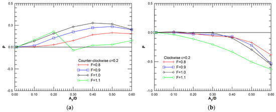Figure 3a presents the variation of time-average power transfer parameter, P, with oscillation amplitude, for the counter-clockwise mode, for the different frequencies considered, while Figure 3b presents the corresponding variation for the clockwise mode. A comparison with the results of transverse-only oscillation (Figure 2a) shows that the values of P attained for counter-clockwise oscillation are higher, with positive values still maintained for Ay/D = 0.6. Consequently, VIV in terms of a counter-clockwise should only occur at higher oscillation amplitude. For the clockwise mode, for F ≤ 1, P is nearly zero at low oscillation amplitude, and is negative and decreasing for Ay/D values higher than about 0.3; negative values, characterized by a monotonic decrease with Ay/D, are attained for F = 1.1. Thus, the appearance of a clockwise mode is less likely in VIV.