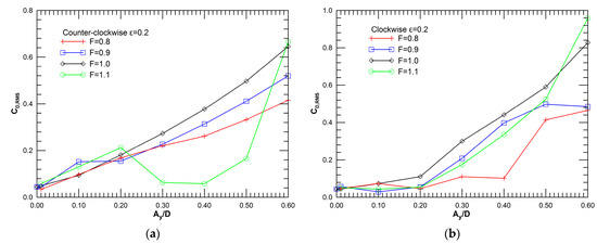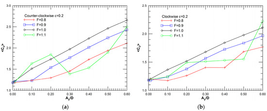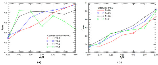 Variation of the RMS of the drag coefficient, CD,RMS, for ε = 0.2, versus the non-dimensional amplitude Ay/D, for frequency ratio F = 0.8, 0.9, 1.0, 1.1: (a) counter-clockwise cylinder oscillation, (b) clockwise cylinder oscillation.