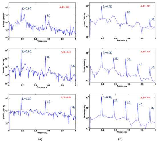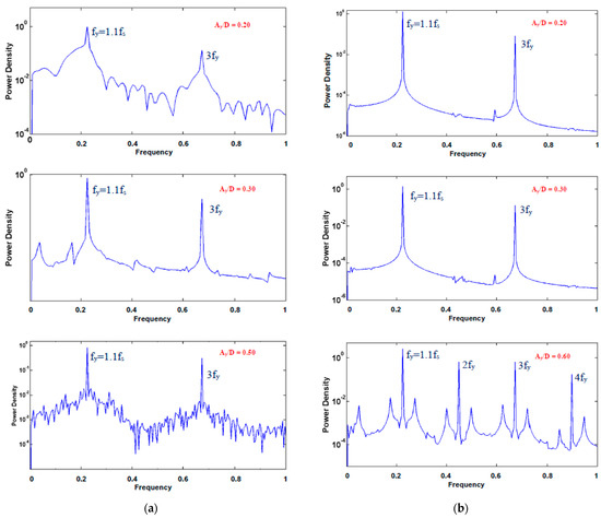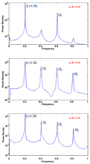 The flow structure and dynamics affects the frequency content of forces. Computed lift coefficient spectra are presented for the two oscillation modes in Figure 7a,b (F = 0.9), Figure 8a,b (F = 1.1) and Figure 9 (F = 1.0, clockwise mode), for representative values of transverse oscillation amplitude, Ay/D ≥ 0.2. In all cases, the spectra demonstrate the absence of Strouhal frequency, and the presence of the excitation frequency and its higher harmonics (lock-in). For F = 0.9, the spectra of both modes exhibit a strong peak at the third harmonic (Figure 7a,b), while they also show the next higher odd harmonic; even harmonics exhibit a strong presence in the case of the clockwise mode (Figure 7b), and are absent from the counter-clockwise mode spectra (Figure 7a). The results presented for F = 1.0 verify the presence of both odd and even harmonics (Figure 9), similarly to the results obtained for F = 0.9. For F = 1.1, the lift spectra of the counter-clockwise mode show the strong presence of the third harmonic, as well as the absence of even harmonics (Figure 8a); for clockwise oscillation, the spectra are populated by only odd harmonics at low and moderate oscillation amplitude, and by both odd and even harmonics at high amplitude (Figure 8b).