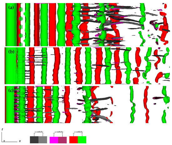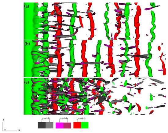 Figure 14 and Figure 15 present flow visualizations at resonant forcing (F = 1.0) for the clockwise mode. This case has been first discussed in the Conference papers of Peppa et al. [34,35], and the results are included here for completeness. Figure 14 presents the flow structure for three values of transverse oscillation amplitude (0.10, 0.20, 0.30); a clear convergence to a two-dimensional 2S wake is demonstrated already at Ay/D = 0.20. For the same cases, Figure 15 presents a visualization of the wake in a plane of constant z. The presence of a two-dimensional wake is evident for Ay/D ≥ 0.20, as well as the presence of the “S+P” mode for Ay/D = 0.30. We note that these transitions do not have a marked effect on the variation of power transfer and force coefficients (Figure 3, Figure 4, Figure 5 and Figure 6). This should be associated with the fact that in all cases shedding is initiated as a 2S pattern, which may by modified into a “S+P” mode farther downstream. Finally, the “S+P” mode is also verified as the cause for the existence of even harmonics in the lift spectrum, in the present case of F = 1.0 (Figure 9).