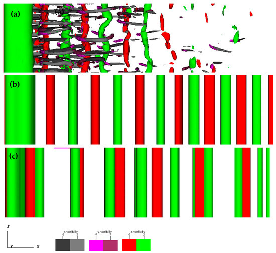 Counter-clockwise cylinder oscillation: Instantaneous vorticity isosurfaces (top view) for F = 1.1 and (a) Ay/D = 0.20, (b), Ay/D = 0.30, (c) Ay/D = 0.40.