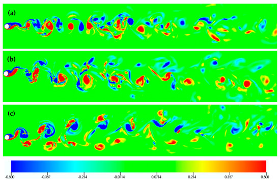 Clockwise cylinder oscillation: Instantaneous isocontours of spanwise vorticity for the plane z = 3 for F = 1.0 and (a) Ay/D = 0.10, (b) Ay/D = 0.20, (c) Ay/D = 0.30.