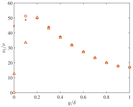 In the cases of D-EV, the eddy viscosity at the cell-center of the first off-wall grid point is set to the desired value at the wall. In both N-EV and D-EV, the value of at the first off-wall grid point is then extrapolated to the wall.