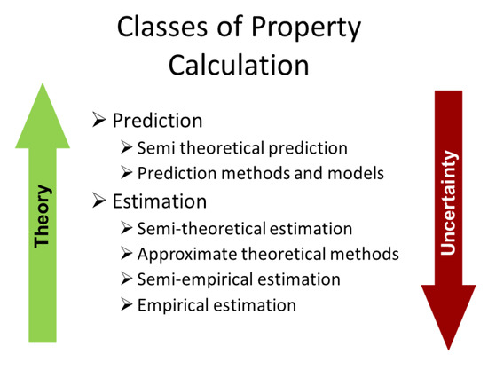In the interest of clarity with set out in Figure 1 the scheme that was first proposed by Nieto Nieto de Castro and Wakeham [8] to characterize the pedigree of various schemes of generation of thermophysical property using their reliance upon molecular theory as the primary discriminant. This idea was further developed by Millat et al. [9], in chapter 3 of this reference. As a corollary, it has been demonstrated that the uncertainty of the generated thermophysical property data increases as the procedure departs more from a sound theoretical basis. The scheme relies entirely upon the correct interpretation of prediction, estimation, and correlation which are often used interchangeably and incorrectly in the literature. This is particularly true now in the field of ionic liquids whether they contain nanoparticles or not and justifies repetition of the correct description of these terms, established more than 30 years ago [8].