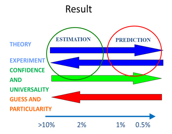 Unfortunately, the words prediction and estimation, are two terms used in current literature interchangeably, without making any reference to their origin and confidence. In particular, it is rare to have the word estimation included in the titles of papers, the authors (and reviewers) preferring the seemingly more erudite word prediction. We summarize in Figure 2 the relation between prediction, estimation, and uncertainty of property calculation schemes. The arrows also define the direction of each contribution (theory, experiment, confidence, universality, guess and specificity) for the magnitude of the expected uncertainty of the property calculation scheme. Values of uncertainties for molecular liquids are given only as an example. For ionic liquids they can, as we shall show below, easily be multiplied by a factor of three. They will also change from property to property.