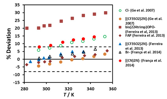 Deviations from Equation (7). Data of Ferreira et al. [47], Ge et al. [48] and França et al. [49] for [P66614]+ ionic liquids. Dashed lines represent the uncertainty of the correlation, at a 95% confidence level.