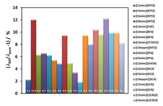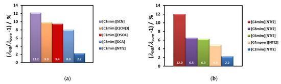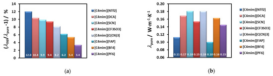 The order for the enhancement decreases as shown in the Figure 7a, while the thermal conductivity of the corresponding ionic liquid varies randomly (7b). In Figure 8 we show the variation of the thermal conductivity enhancement with the same cation, [C2mim]+, (a) and with the same anion, [(CF3SO2)2N]−, (b). The ion size does not seem to have a specific effect, as was discussed for thermal conductivity dependence of the same liquids [77]. The sequence obtained for the thermal conductivity was: [(CN)2N]− > [C(CN)3]− ≈ [SCN]− > [BF4]− > [PF6]− > [CF3SO3]− > [(CF3SO2)2N]− > [(C2F5)3PF3]−. A bulky ion like [(C2F5)3PF3]−, which is much less mobile, seems to contribute to a very low thermal conductivity. Cyano-anions introduce a much higher value for the thermal conductivity, and a stronger dependence on temperature. The thermal conductivity of [C4mim][BF4], with the smallest anion, is high, but lower than that of cyano-compounds, especially at the lower temperatures. For the other ILs the value of the thermal conductivity increases with decrease of the anion size. Smaller anions have, in principle, better mobility, increasing the ionic interactions and consequently promoting more heat paths.