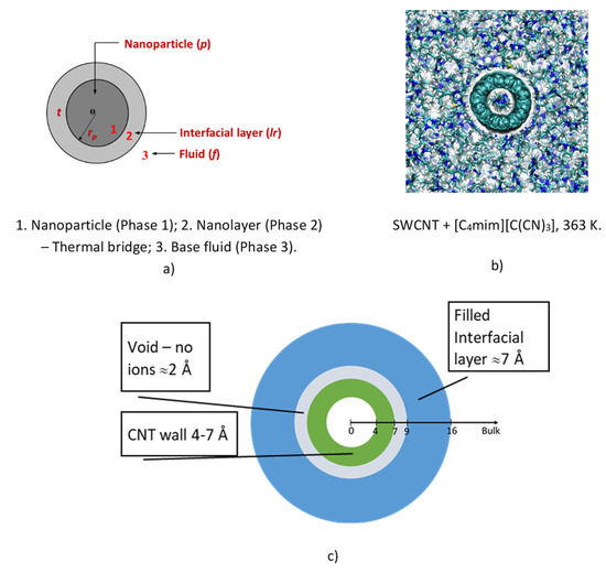 (a) Schematic representation of interfacial layer model for a spherical particle. (b) Snapshot of simulation box with SWCNT + [C4mim ][C(CN)3], 363 K [75]. In this simulation there are molecules (ions) of the ionic liquid inside the CNT. The interfacial layers between the CNT walls and IL (in and out) are clearly seen, also showing void spaces (no ions). (c) The simulation approximate dimensions: outer diameter of the SWCNT was 1.4 nm (14 Å); SWCNT inner diameter was 4 Å and the outer diameter 7 Å. Geometry is assumed to be similar along the axial dimension of the nanotube.