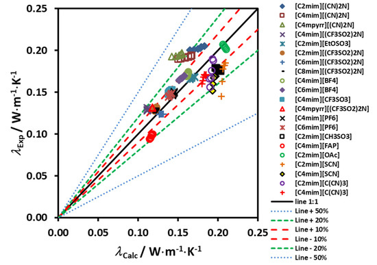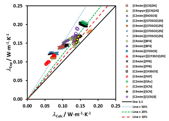 The application of a hard-sphere scheme to the estimation of the viscosity and thermal conductivity of ionic liquids has been reported by Gaciño et al. in 2014 [41], with success. A database of 461 viscosity and 170 thermal-conductivity measurements for 19 ionic liquids was used. Expanded uncertainty at the 95% confidence level was 4.6% and 6.3%. According to the model, the reduced thermal conductivity, λ*, is defined in Equation (5) as: