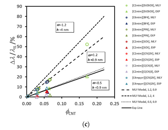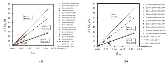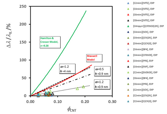 In this paper we will restrict the analysis to the systems based on dispersions of MWCNTs in ionic liquids. In our first paper [6], the Maxwell model [77] and the Leong et al. [78,79] models for spherical nanoparticles were used to explain the thermal conductivity enhancement in several IoNanofluids. However, in the second of these models, calculations are strongly affected by the values assumed for the thermal conductivity of the interfacial layer and for its thickness [49,69,70,71]. As an example, for an interfacial thickness of 2 nm, the model of Leong et al. can only be applied to systems with an enhancement higher than 20%, which usually happens only for high volumetric nanoparticle fractions (>3%). In our system with [C4mim][(C2F5)3PF3][76], a very small value of enhancement (6.2%) was found.