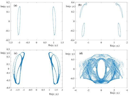 To characterize the system dynamics we use Poincaré sections shown in Figure 1 for the initial conditions presented in Table 1. Figure 1 shows the distances between poles with the indexes “1” and “3” at the moment when the amplitudes of second and third solitons are equal to each other, that is, . Figure 1a corresponds to the initially close position between poles. In this case, the dynamics of solitons is regular; their positions oscillate around a common center of mass. When the initial position of the first pole is shifted to the real numerical axis, the Poincaré section is deformed as shown in Figure 1b. With a further shift of the pole to the real axis, the toroidal trajectories in phase space begin to break down, see Figure 1c. This behavior is consistent with the Kolmogorov-Arnold-Moser theory developed for description of chaotic motion in Hamiltonian systems. Finally, Figure 1d shows the developed chaotic state of the system under study for the initial condition presented in fourth line of Table 1.