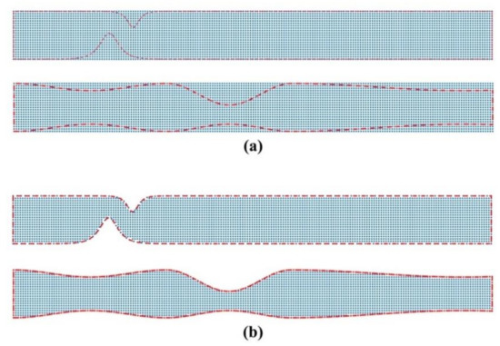 We use a uniform Cartesian grid, embedded into the irregular geometry; to represent the flow domain, we use regular (uniform) nodal distribution embedded into the flow domain. In the case of the unsymmetrical stenosis, a grid of 151,703 nodes (corresponding to node spacing) is used, while in the channel with multiple stenosis we use a grid of 127,427 nodes (corresponding to node spacing). Both grid ensure grid independent numerical solutions. In our simulations, we set , , and and .
