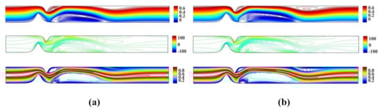 Figure 7 shows the streamlines, vorticity and microrotation contours, along with isotherms obtained for the unsymmetrical stenosis flow case. In our simulations, we set