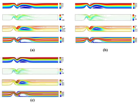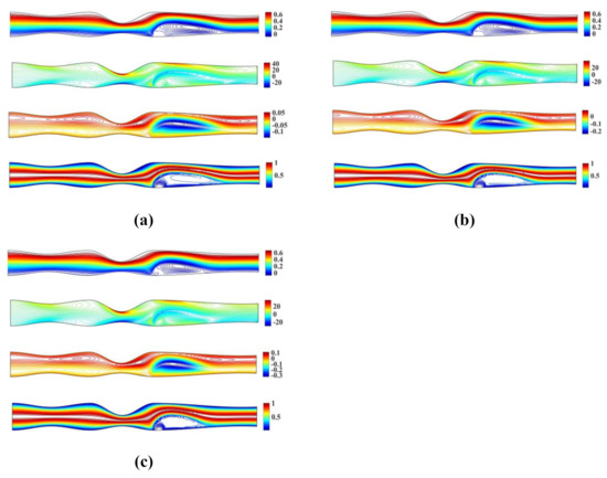 Figure 6 shows the streamlines, vorticity and microrotation contours, along with isotherms for the unsymmetrical stenosis flow case for different Reynolds numbers. It is well observed that the streamlines, vorticity and microrotation contours and the isotherms are distorted from being straight lines in the region after the stenosis. A vortex following the circulation is formed downstream of the stenosis close to the upper wall in both streamlines and isotherm profiles. As the microrotation number increases, the re-attachment length of the vortex decreases (the vortex is actually compressed). Additionally, the vortex formed at the upper wall of the stenosis is also compressed when microrotation number increases. The same pattern appears to vorticity, microrotation and temperature filed values.