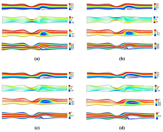 The positive constants A1, A2 control the degree of constriction of the channel, while B1, B2 are the constants controlling the length of the stenosed area. The stenosed parts at the lower and the upper plates are positioned at sites with coordinates x1 and x2, respectively. Herein, we considered A1 = 0.5, A2 = 0.4, B1 = 6 and B2 = 4, while the stenosed sites were positioned at x1 = 3 and x2 = 4.