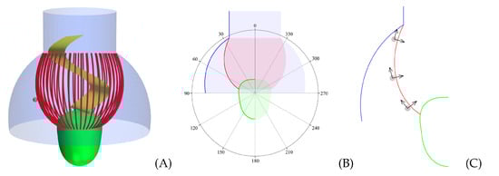 When constructing the model morphology of D. grandis, the assumption of symmetry around the longitudinal center axis is utilized in shaping the lorica, filter, and cell. This allows for each part’s surface to be constructed as a simple curve, which can readily be revolved around the center axis of symmetry (Figure 2A). The equations for the curves of revolutions were obtained by averaging the outline of the mid-plane view of six different instances of the species [5,9]. The first resultant curvature equation models both the lorica dome, , and the cell, , and the second curvature equation models the collar filter, . Both curvature equations are given, respectively, as: