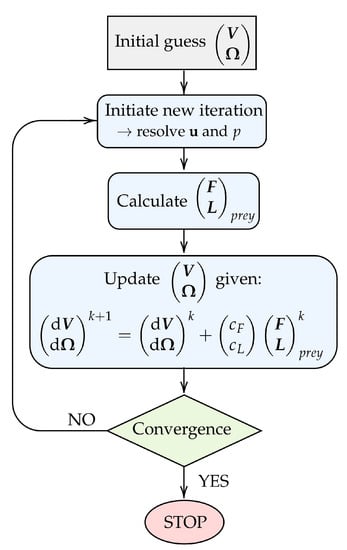The procedure for obtaining the prey velocity and rotation rate in each discrete time step is illustrated in Figure 3. Firstly, an arbitrary initial guess is assigned to the unknown and . This allows for the flow velocity and pressure fields to be computed using the SIMPLE algorithm [20]. Subsequently, the forces and torques acting on the prey surface can be deduced. Given the prey forces and torques, we update the prey velocity and rotation rate using the relation:
