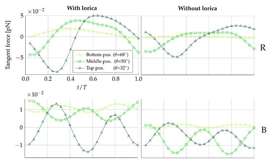 The two columns in Figure 4 show the difference in tangential forces for a loricate and non-loricate D. grandis. Removing the lorica does not seem to have an effect on the overall trend of the force time history, though it does affect the magnitude of the simulated forces. In the vane plane (), it is especially noticeable that removing the lorica reduces the magnitude of the predicted forces. At some points in a beat cycle, the force reduction even leads to a change from a positive force to a negative force. Thus, this is an improvement in the degree of prey transportability. Observing Figure 5, it becomes apparent that the lorica directs the incoming flow field upwards, whereas in the non-lorica D. grandis, the flow reaches the collar at a more horizontal direction. Assuming equal flow magnitudes, it requires less force to direct a horizontally orientated flow downwards, as compared to directing an upwards-orientated flow downwards. Consequently, this explains why we see a reduction in the tangential forces for the non-loricate D. grandis in Figure 4. Furthermore, it is observed that the amplitude of the force magnitude is generally reduced in the non-loricate case as compared to the loricate case. We find no direct explanation for this. However, it seems probable that the cause could be related to either the orientation of the flow near the collar or a shielding effect from the presence of the lorica.