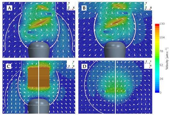 The normal velocity component obtained for from the static and dynamic approaches seems less comparable than the tangent velocity results, judging by Figure 8. However, both approaches still evaluate the magnitude of the normal velocities to be within the same order. Considering , the static and dynamic results vary more compared to , which is expected due to the bigger impact that a larger particle has on the local flow field. Hence, we expect the static and dynamic results to vary more when increasing the prey size, which is the trend that is observed. The resultant local flow fields when fixing , as compared to letting it freely drift, are shown in Figure 9. Considering Figure 9A,B, we observe that the fixation of the prey gives rise to a change in the flow direction from upstream to downstream around the prey. This non-trivial change in the velocity field may cause a change in the resultant force on the prey. Hence, the artificial motion of the fixed prey (as predicted by the Stokes law) will be different from that of the freely drifting prey. In Figure 9C,D, the flow field direction around the fixed prey is not changed as drastically, as seen in Figure 9A,B. However, Figure 9 only considers a discrete instance in time at a certain collar position. Therefore, the figure only confirms and visualizes that the fixation of prey does, in fact, alter the local flow field to an extent that seems significant to the prey motion.
