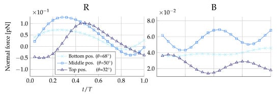 Normal force distribution on medium-sized prey during one beat cycle with period T. Here, negative forces are orientated in the direction away from the collar. Both plots are simulated without the presence of the lorica. The left-hand plot shows the forces on prey placed on the right (R) side of the collar, and the right-hand plot shows forces on prey placed at the back (B) of the collar.