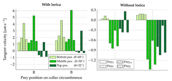 Resultant tangent velocity of fixed prey when using Equations (10) and (11) to convert simulated forces (Table 3) into velocities. Here, a negative velocity is directed towards the cell. The left plot is simulated with the lorica and the right plot without. Velocities are shown for prey placed in the beat plane on the right (R) side of the collar and in the vane plane on the back (B) side of the collar. For each vertical position on the collar (), the velocity is shown for each type of prey considered: small (s), medium (m), large (l), and elongated (e). The two legends apply to both plots.