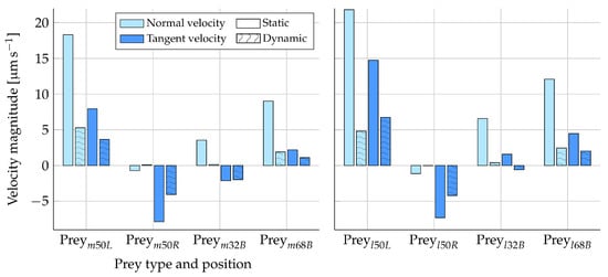 Figure 8 shows the difference in the tangent and normal prey velocity between the static and dynamic analysis. The Stokes law (Equation (10)) is expected to give an overestimation of the prey velocities calculated from prey forces due to the boundary effects of the nearby microvilli (Section 2.1.2). In Figure 8, it can be observed that the velocities are generally evaluated to a higher value in the static simulations as compared to the dynamic simulations. This trend is therefore consistent with our prior expectations. The directions of the velocity components are also found to be the same in both the static and dynamic analysis, with the exception of some near-zero velocities. Considering only the tangent velocities for , the static simulations overestimate the prey velocity magnitude by, at most, approximately two times as compared to the dynamic results.