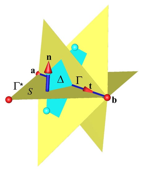 Discrete geometric structure: a set of primitive planar facets are associated with the segment of unit vector whose ends a and b are distant by a length d. Each facet is defined by a contour , a collection of three segments , is oriented according to the normal such that ; the dual surface connecting the centroids of the cells is also flat.