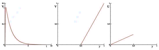 Fluid–structure interaction between a viscous fluid and an elastic solid; the viscosity of the fluid is equal to = 1 m s and the solid shear modulus is equal to = 4 m s: (left) the velocity of the interface over time is presented; (middle) the velocity at steady-state regime is reported; and (right) the displacement of the solid is plotted.